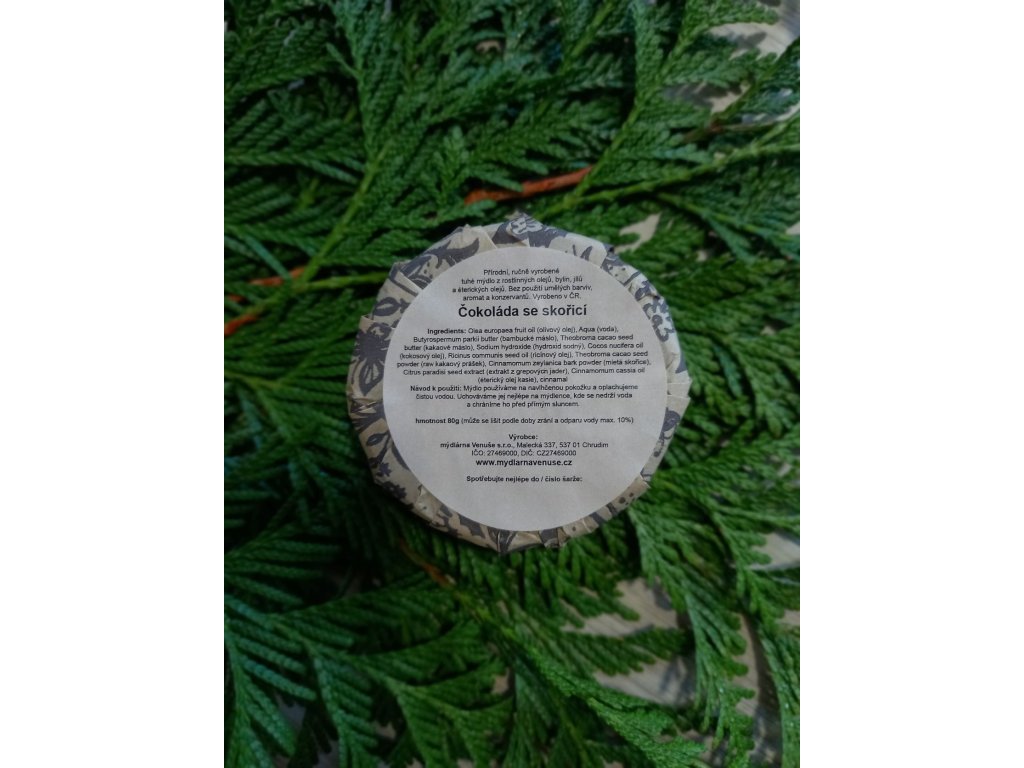 Ingredients: Olea europaea fruit oil (olivový olej), Aqua (voda), Butyrospermum parkii butter (bambucké máslo), Theobroma cacao seed butter (kakaové máslo), Sodium hydroxide (hydroxid sodný), Cocos nucifera oil (kokosový olej), Ricinus communis seed oil (ricínový olej), Theobroma cacao seed powder (raw kakaový prášek), Cinnamomum zeylanica bark powder (mletá skořice), Citrus paradisi seed extract (extrakt z grepových jader), Cinnamomum cassia oil (éterický olej kasie), cinnamal
