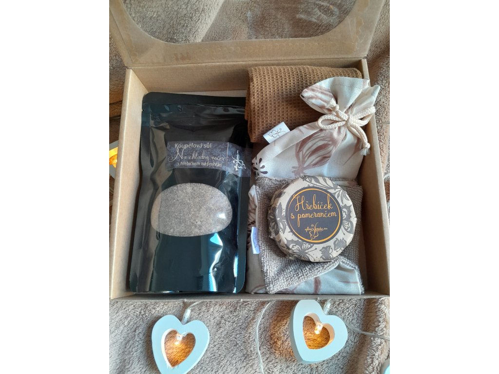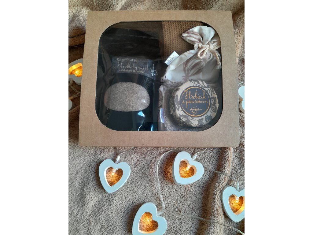 Sada obsahuje koupelovou sůl Na chladný večer, mýdlo Hřebíček s pomerančem, látkové odličovací tampónky, bavlněný mini ručníček a žínku z bavlněného plátna a bambusového froté.
