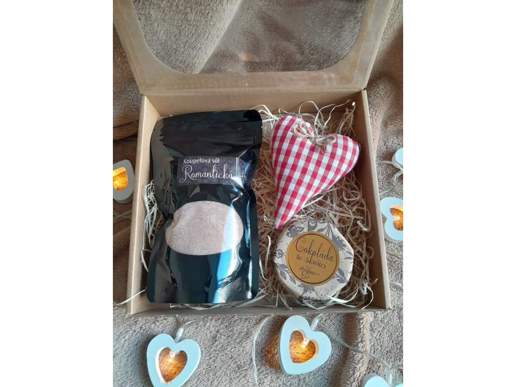 Obsahuje sůl do koupele, mýdlo a látkovou ozdobou ve tvaru srdce.